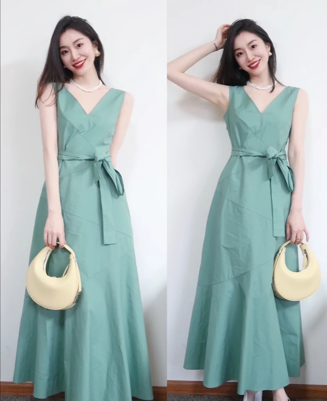 在眾多彩色之中,藍色和綠色被視為熱門的存在,它們二者都可以達到對氣氛的調整作用,不管是清爽氣氛的形成,還是活力氣質的展現,都會比黑色或白色的裙裝更勝一籌。像這條綠色的裙裝單品,它能襯托出典雅的韻味,服裝的設計簡單,腰部的輪廓收緊,更顯曲線,更顯腿長。