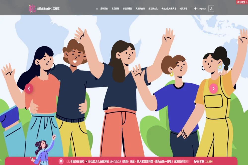 網站構思理念,以桃園在地新住民之文化特色為軸,打造屬於桃園獨一無二的風格,主視覺設計採滿版橫幅,展現多族群融合感,分區部份則使用卡片式呈現,輔以豐富插畫風格,打造溫馨友善的使用介面,網頁中特別設置推薦專區,用以置入主要推廣內容及本府各局處預計辦理之新住民活動及政策,便利新住民瀏覽並有效率找到所需服務,網頁中部份留白的設計,更方便了多語言切換時的閱讀,營造新住民易於操作的使用體驗。