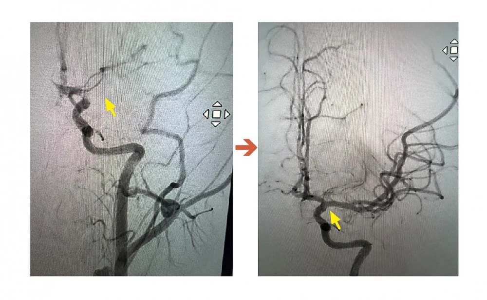 ICA血管攝影,圖左箭頭處為血栓阻塞血管。圖右箭頭處為已打通血管。