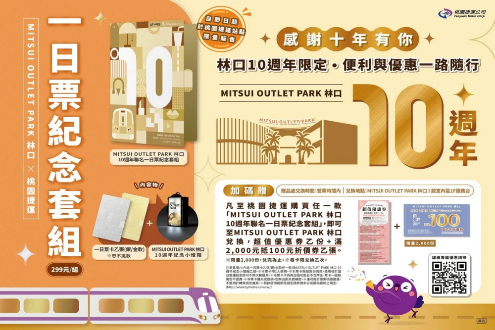 還在煩惱過年新衣、送禮選擇或寒假親子行程嗎?桃園捷運公司結合MITSUI OUTLET PARK林口開館10週年及「10週年誕生祭」活動,推出限量聯名一日票紀念套組,自1月19日起正式開賣。每組優惠價299元(原價320元),內含限量版桃捷一日票1張,並贈送專屬設計會發光的紀念小燈箱鑰匙圈1個,僅限本次紀念套組獨家入手。只要一張票卡就能輕鬆串聯購物、玩樂與城市小旅行,更加碼集結65間人氣品牌店家消費優惠,讓民眾搭乘機場捷運一路買、一路玩。