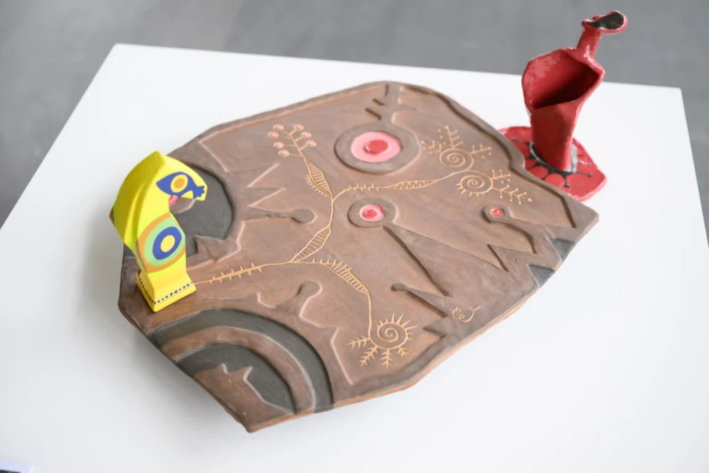 享譽國際的排灣族藝術家伊誕.巴瓦瓦隆首次發表陶作品《MACAQU》,在排灣語中ma-caqu代表「明白、心被照亮的時刻」,他以大地作為棋盤、小馬化為棋子,代表人生中的每一步都在探索中得到智慧與祝福。近年活躍於藝術創作及商業影像的多元媒體藝術家李承道則帶來《藍色的馬克》,揉合新北市在地文化特色之三峽藍染、青花瓷等各種「藍」色為主要用色,以寬線條、漸變色彩及如同釉藥結晶的光澤,帶點未來感與趣味性。