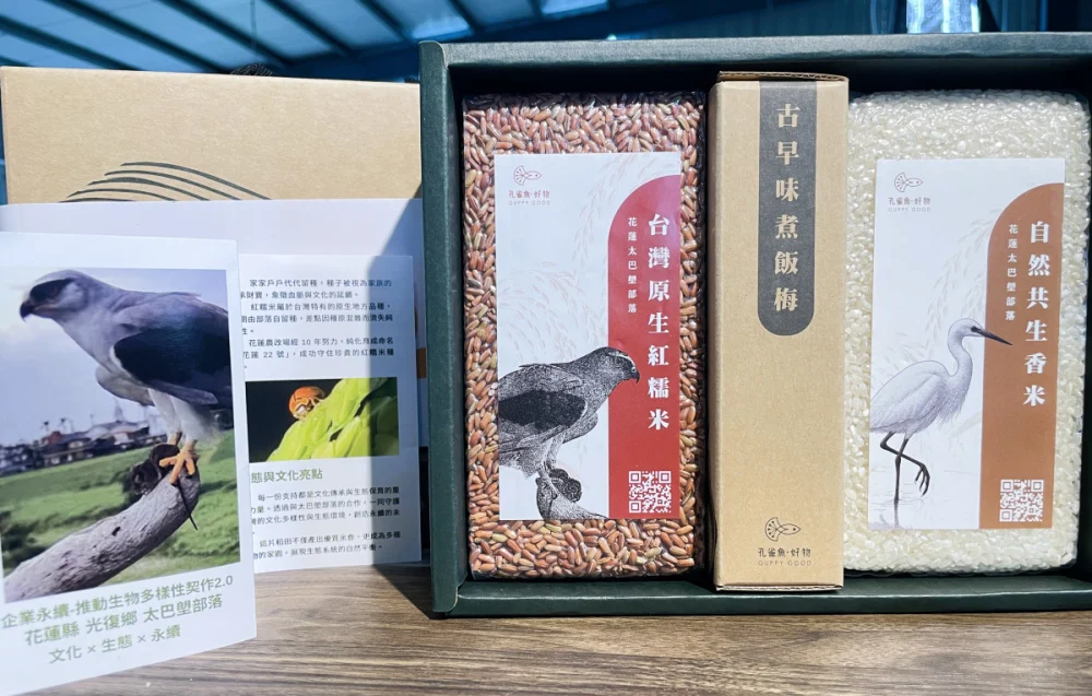 「花蓮縣光復鄉太巴塱社區營造協會」的米禮盒,嚴選紅糯米與高雄147米,搭配古早味煮飯梅,傳遞豐收祝福;「臺灣原住民教育經濟發展協會」則以原住民族特有香料馬告結合土鳳梨,製作風味獨特的馬告鳳梨酥,成為別具特色的年節伴手禮。