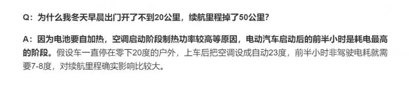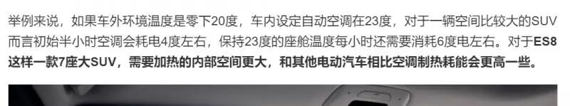 電池自加熱系統耗電蔚來官方公布:因為電池要自加熱,空調啟動階段制熱功率較高等原因,電動汽車啟動後的前半小時是耗電最高的階段。假設車一直停在零下20度的戶外,上車後把空調設成自動23度,前半小時非駕駛電耗就需要7-8度,對續航里程確實影響比較大。