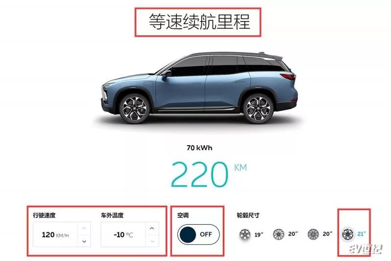 蔚來ES8電池容量為70度,按照-10℃,表顯滿電續航里程256公里來計算,每度電可行使的里程為3.657公里,13度電則為47.54公里。早上啟動車輛,這時在去80公里以外的地方可能就回不來了,因此我們將行駛距離減少到65公里。65公里行駛了一個半小時,加上啟動時電耗加熱和空調耗電,一個半小時的行程會消耗掉112.54公里續航。剩餘續航為256-112.54=143.46公里。同樣條件返程,期間實際行駛了130公里,剩餘續航30.92公里。以上我們推算的是蔚來ES8的市區工況,以北京五環內的交通路況,一個半小時行駛65公里已經是很暢通的路況了,並且隨著行駛時間的增長,續航里程還會被暖風消耗更多。並且我們是按照電池並沒有因物理特性衰減的70度來計算的每度電可行駛里程,如果考慮到這點因素,計算出的續航里程還有可能進一步減少。冬季高速120公里等速續航推算EV根據蔚來官網的續航里程計算器計算,時速120km/h,外界環境溫度-10℃,車輛輪胎為21寸輪圈,關閉空調後的等速續航里程數值是220公里。