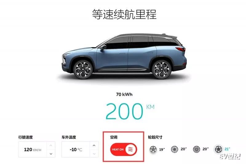 再回到蔚來官方的續航里程計算器,在時速120公里,外界環境溫度-10℃,車輛輪胎為21寸輪圈,開啟空調狀態下,續航里程達到200公里。根據上述沒開空調下推算的續航里程為150公里的情況來看,開空調時肯定達不到200公里。