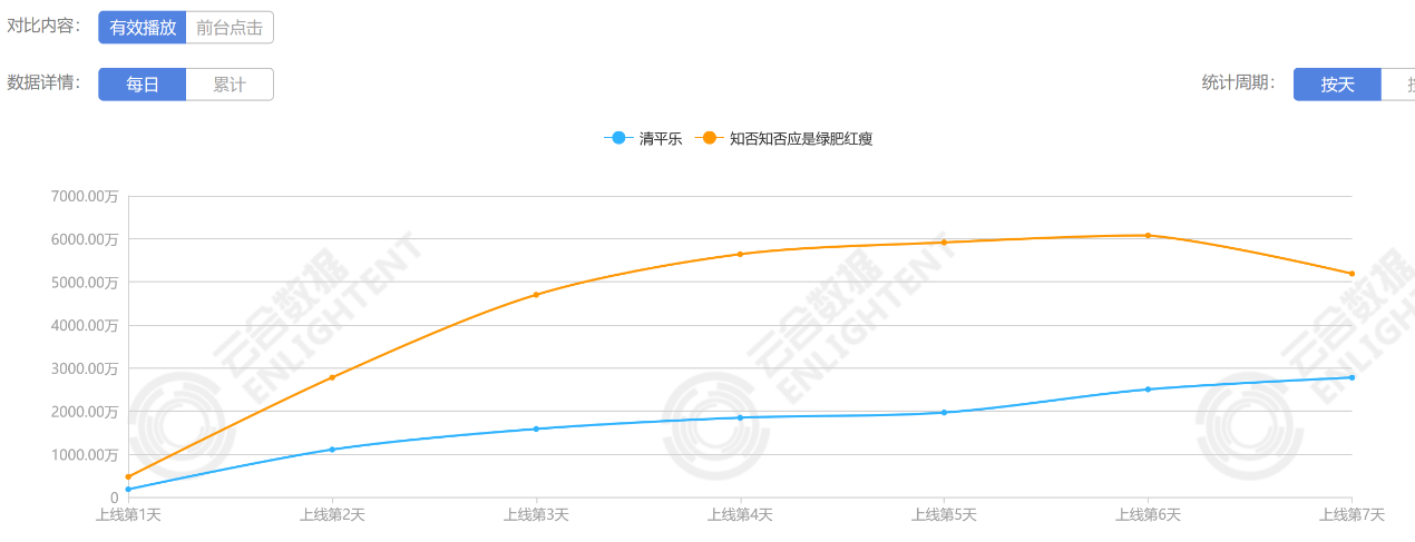 從播放量上來看,《清平樂》的成就也遠不及去年的《知否知否應是綠肥紅瘦》。因《知否》是優愛騰三家聯播,《清平樂》是一家平臺獨播,我們就取這兩部劇上線七天後在這一家平臺上的播放量進行對比,得到結果如下: