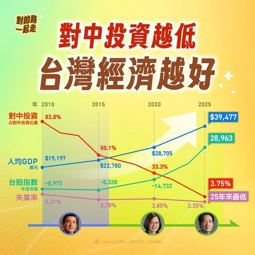 主計總處公布台灣114年第4季經濟成長率概估為12.68%,推升全年經濟成長率達8.63%,創民國100年以來、15年來最高水準。主計總處也指出,114年人均GDP為3萬9477美元,直逼4萬美元大關。民進黨在臉書大內宣表示,台灣的好成績不只贏中國、贏美國、贏韓國、贏日本,也是世界主要國家中最棒的!民進黨秀政績圖卡狠酸馬政府,強調「對中投資越低,台灣經濟越好」。