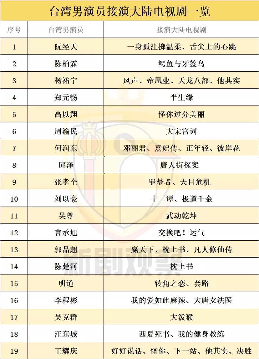 19位臺灣當紅男演員大陸接演電視劇一覽