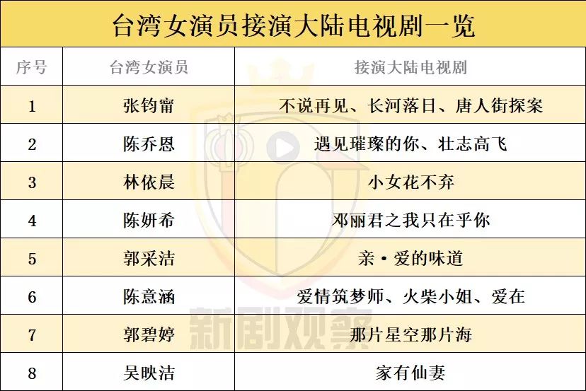 新劇觀察(ID:xinjuguancha)選取了具有代表性的8位臺灣當紅女演員大陸接演電視劇檔期情況。