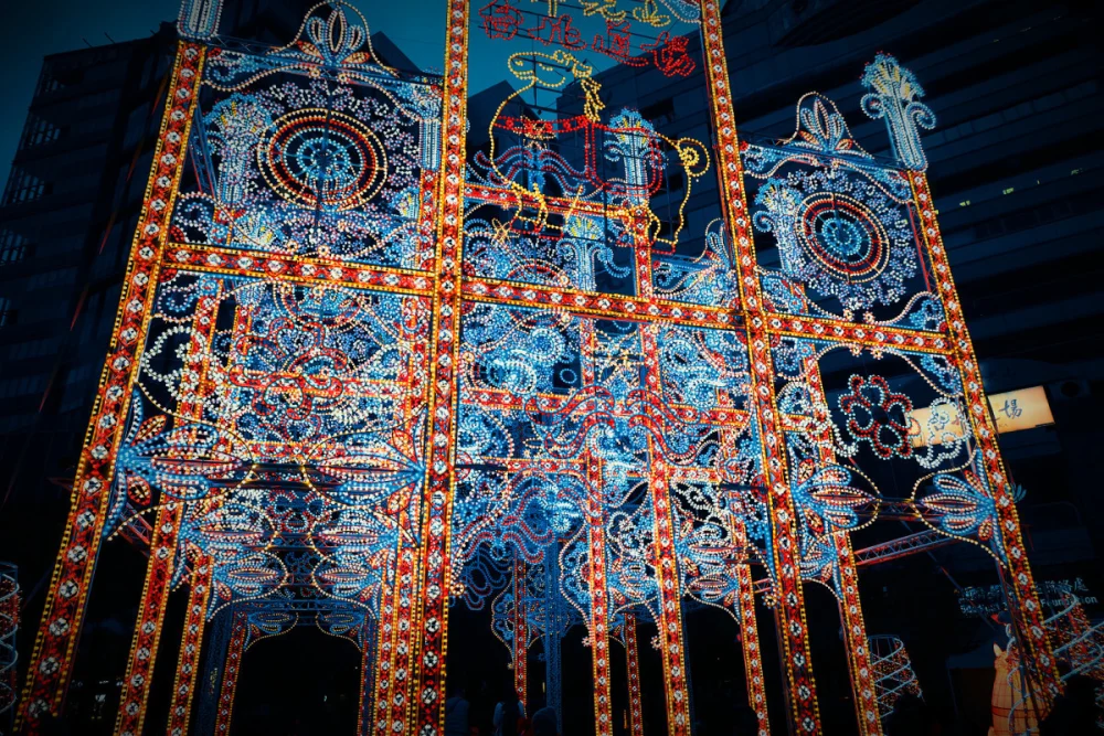 巴洛克風華: 主燈「希望之門」以華麗亮眼的巴洛克風格呈現,為信義區街頭增添神聖且溫潤的光影,象徵為市民開啟幸福之門。