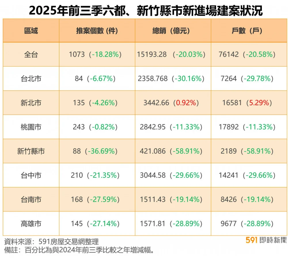 受房市政策效應延續,2025 年前三季的推案個數、總銷及戶數均較去年同期衰退。591 全房產曝光第一平台!新建案覆蓋率 99%,新「限時優惠專區」讓建案大PK