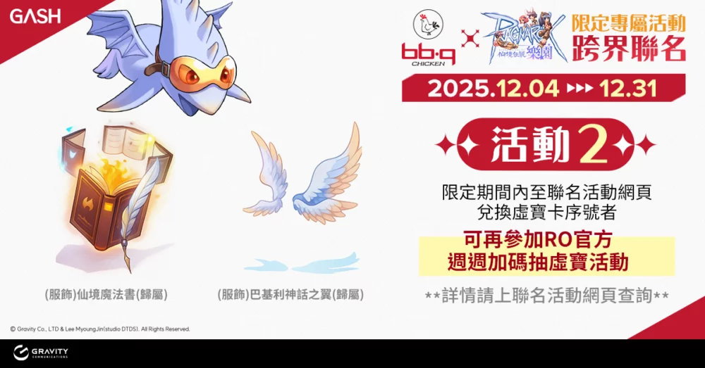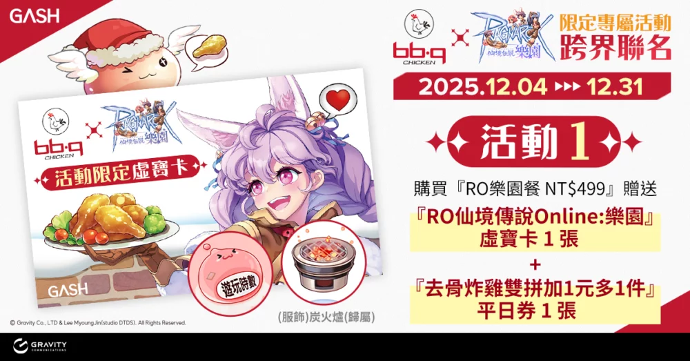 《RO 仙境傳說Online:樂園》與《bb.q CHICKEN》跨界合作,推出聯名期間限定餐點『RO樂園餐』。即日起至12/31期間,凡購買「RO樂園餐」即可獲得『RO x bb.q聯名限定虛寶卡』一張,以及『去骨炸雞雙拼加1元多1件』平日兌換券1張。虛寶卡內容除了會贈送免費遊玩時數外,還能獲得虛寶【(服飾)炭火爐(歸屬)】,此服飾虛寶為只限本檔活動取得,遊戲中不會再有其他取得管道,敬請所有玩家多多把握機會。另外本次活動中,同一個遊戲帳號並不限活動虛寶序號兌換次數。