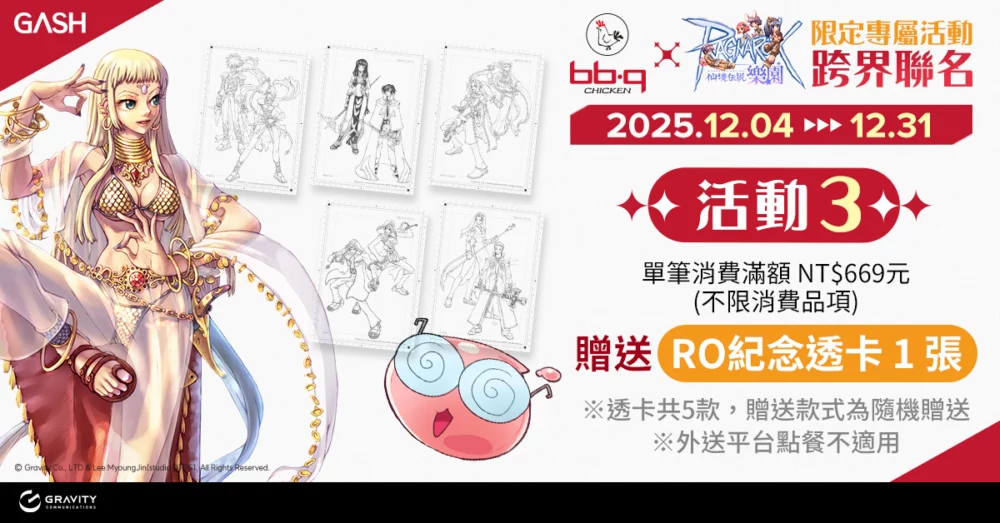 格雷維蒂互動旗下PC遊戲《RO 仙境傳說Online:樂園》今(4)日宣布聯名《bb.q CHICKEN》,推出聯名餐點【RO樂園餐】,活動期間為12/04(四)至12/31(三),只要在活動期間到《bb.q》門市內完成指定消費,就可獲得『RO x bb.q聯名限定虛寶卡』,以及『RO紀念透卡』等好禮。