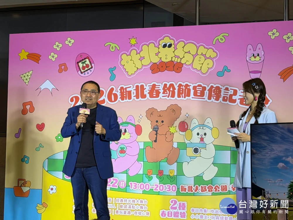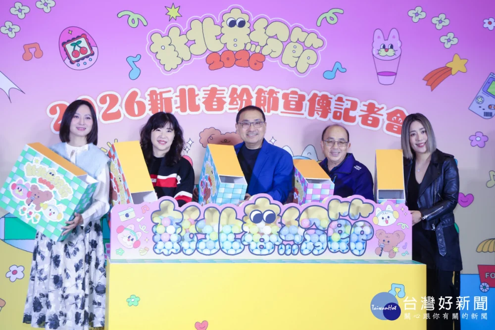 新北市長侯友宜出席記者會正式揭曉「2026 新北春紛節」年度亮點。今年的活動主視覺,特邀人氣插畫藝術家「卡肉老ㄙの波波冰狗室」跨界操刀,由筆下熱門 IP「波波冰狗室」的三位主角「趴皮」、「乖咪」與「柴柴」,帶領大眾重返最繽紛的青春年代。今年活動以「春紛好__」的留白哲學,分別策劃【春紛好聲音】、【春紛好Chill】和【春紛好自得】三大主題區,以「集體記憶」為語言,透過三大舞台交織出跨時代的共感時刻。