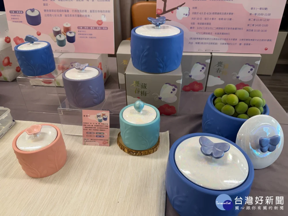 陶博館醃脆梅DIY將於4月3日至4月26日週末假期在陶瓷藝術園區風廣場舉行,由南投縣水里鄉槑休閒農業區發展協會專業講師帶領民眾使用南投現採青梅製作脆梅,活動限定使用蝶型蓋鈕大甕,報名費每甕原價899元,3月31日前報名享早鳥優惠價799元;另搭配活動推出的四款限量小甕則於陶博館文化商店及小陶窩販售,售價799元。