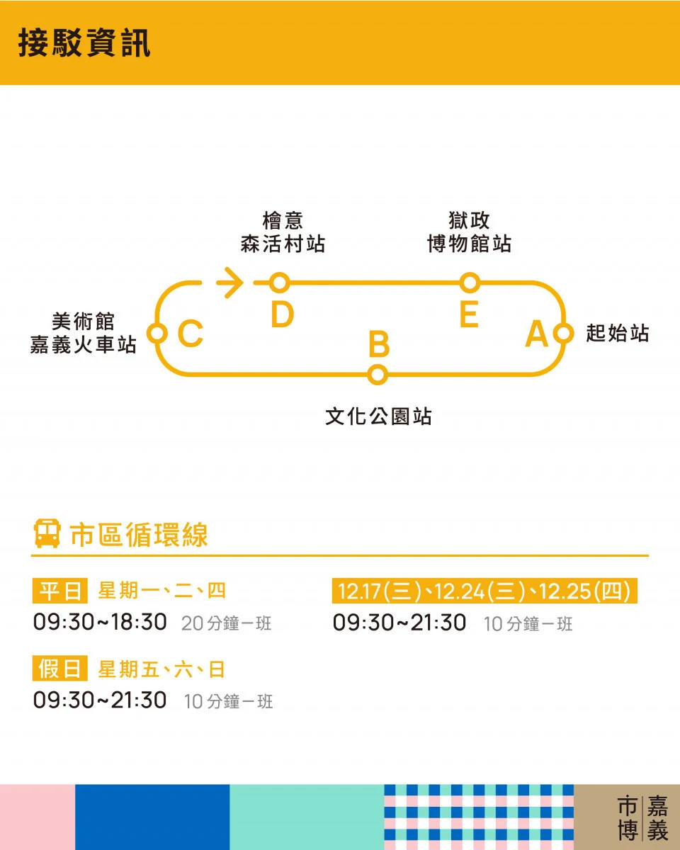3、另為服務民眾可以順利至各展區參觀,活動期間有免費接駁車服務,採市區循環線行駛,由公明路總站發車後,中途設有「文化公園」、「美術館(嘉義火車站)」、「檜意森活村」、「獄政博物館」等,再回到公明路總站,平日為20分鐘一班車,發車時間自9:30至18:30,如逢星期三、星期五至日及12月25日(星期四)則視為假日,為10分鐘一班車,發車時間自9:30至21:30,另假日時段有開行湖子內支線,由公明路總站發車後,中途設「健康三路」及「健康九路」等站,為1小時一班車,如您係自行開車者,歡迎多加利用。