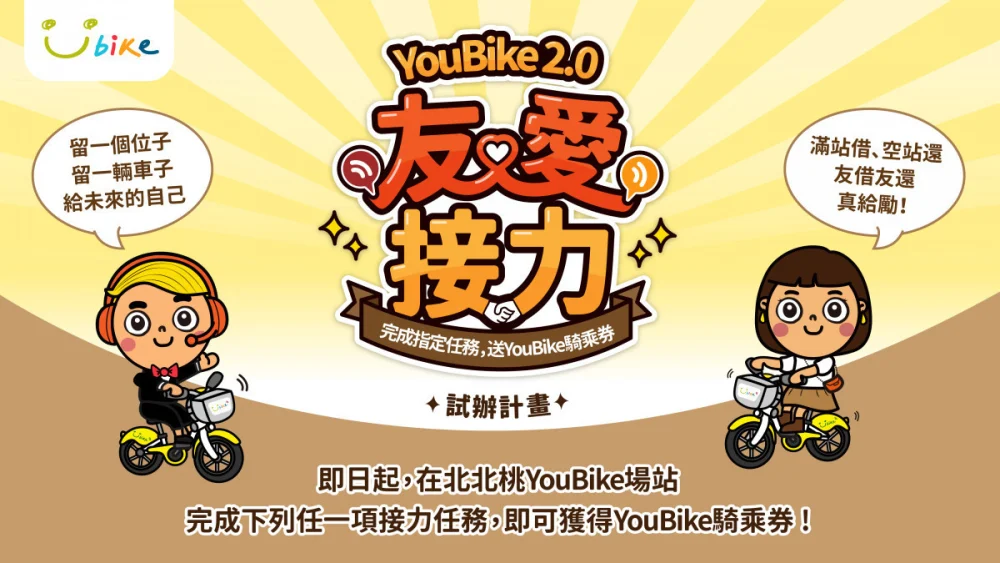 北北桃3市將於明(115)年元旦同步推出「YouBike 2.0友愛接力」試辦計畫;新北市交通局表示,YouBike會員只要從無位(滿站)場站借出YouBike 2.0自行車,或將2.0自行車歸還至無車(空站)場站,即可獲得每次5元的騎乘券,10分鐘內最多可獲得2次獎勵,讓下一位使用者更容易借到車、停得到車,共同打造友善共享的騎乘文化。