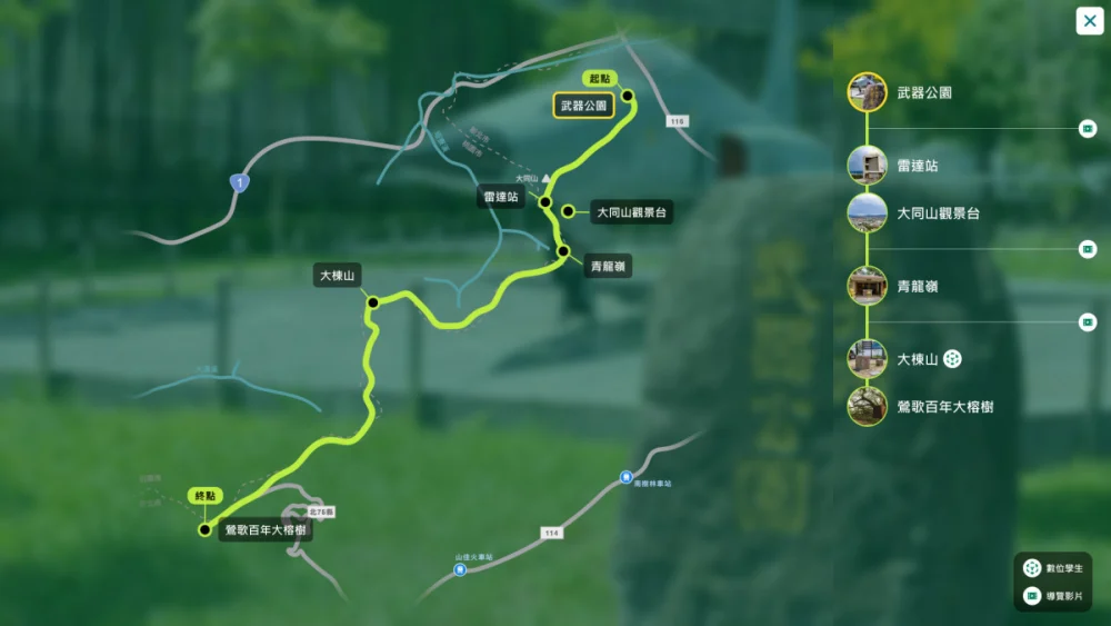 系統特別採用超高解析全景並結合數位孿生技術,使用者能自由切換視角,細緻觀察武器公園的歷史遺跡、雷達站的開闊視野,以及百年大榕樹的蒼勁姿態。配合在地生態解說及步道文化介紹,搭配環境音效與AI語音導覽,打造沉浸式的數位體驗,讓民眾在家也能預先規劃行程,實際走訪時更能深度體驗。