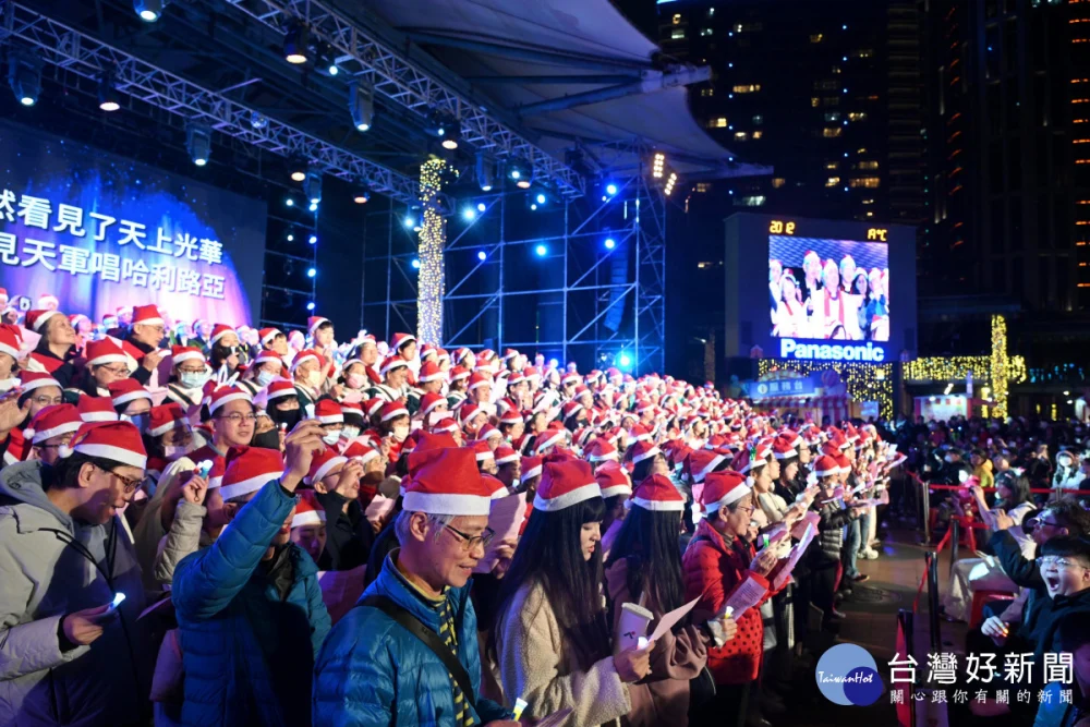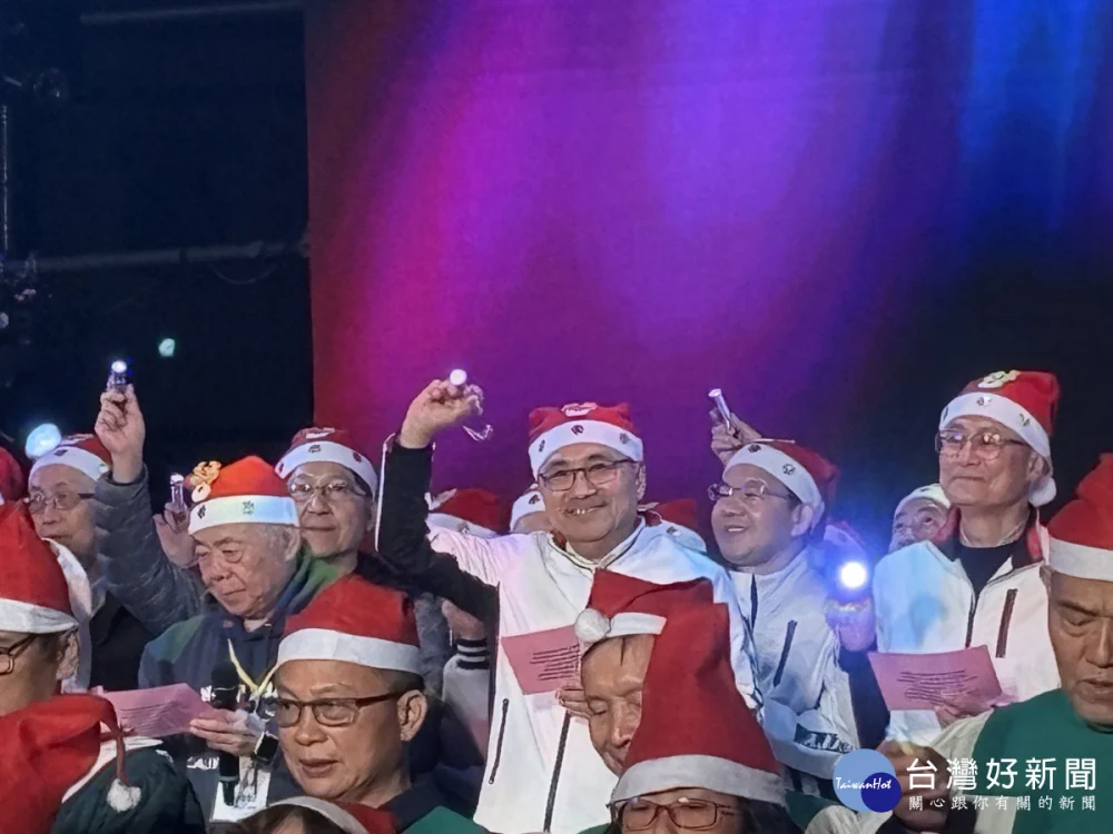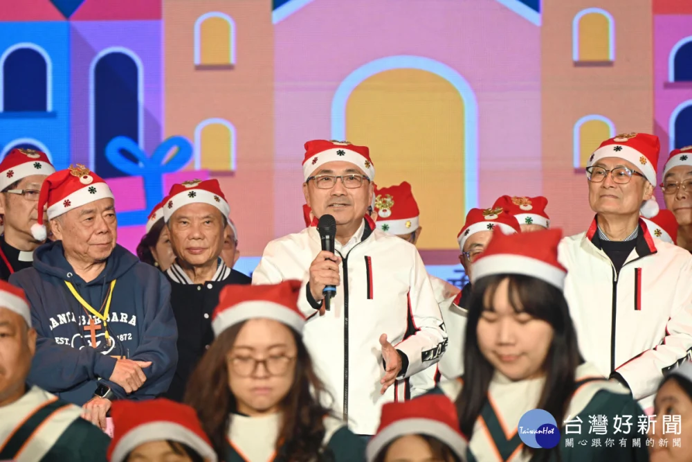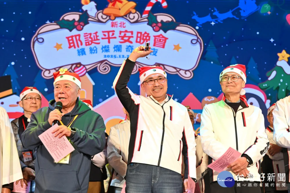 2025新北市耶誕平安晚會今(21)日的愛心園遊會到晚間的平安晚會,洋溢濃厚的耶誕氣氛,吸引大批民眾參與。市長侯友宜晚間領銜市府團隊與各教會牧長、百人詩班向萬名遊客報佳音,為城市送暖,與現場民眾一起唱和《普世歡騰》、《平安夜》、《是為了愛》等聖誕詩歌,嘹亮歌聲響遍耶誕城,傳遞愛與祝福。