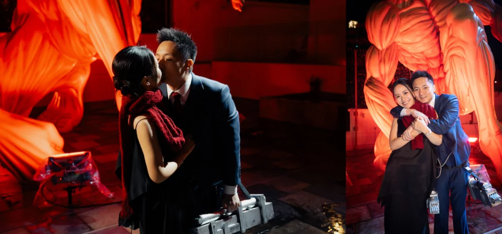 左-鍾培生與莊雅婷深情擁吻、右-與莊雅婷在巨人前甜蜜合照,圖片來源:香港電競有限公司 香港豪門傳喜訊!身價百億的「富四代」…