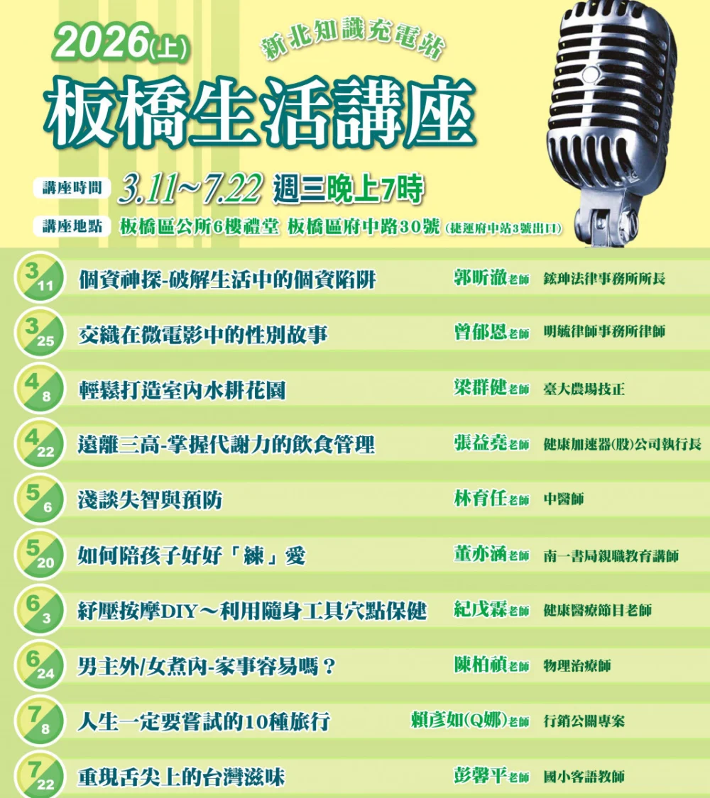 記者黃村杉/新北報導 備受好評的「板橋生活講座」又將開講,將於3月至7月週三晚間7時起共舉辦10場,地點在板橋區公所6樓禮堂(…