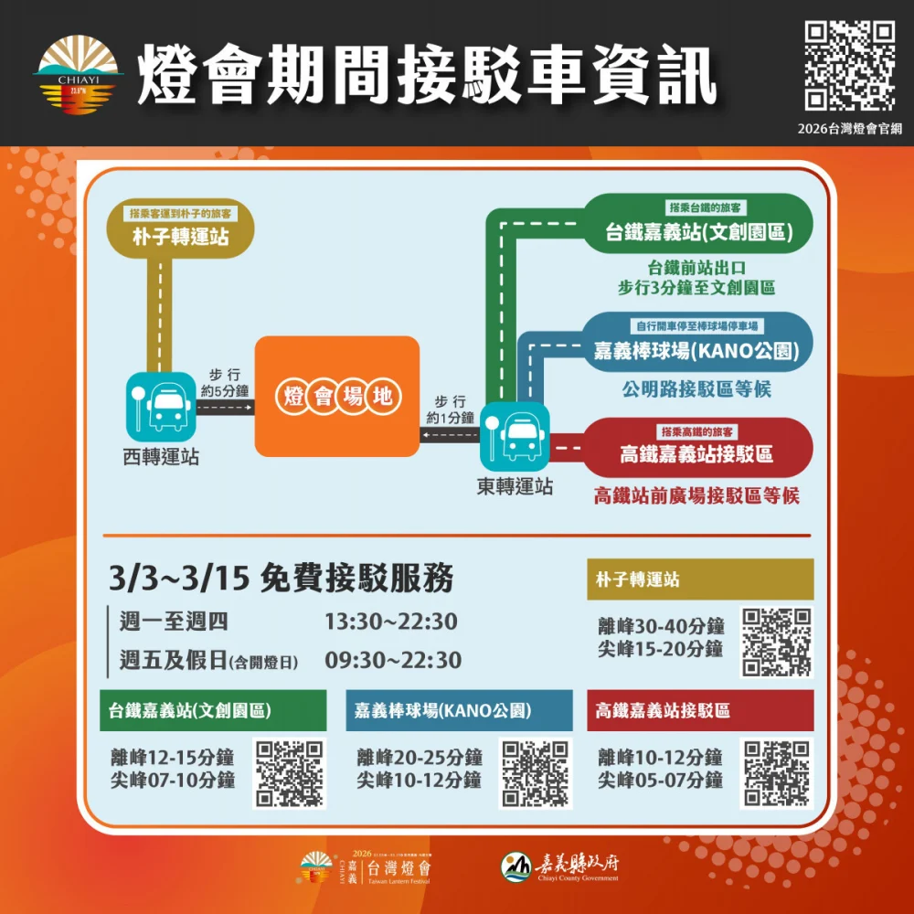 記者陳致愷/嘉義報導 2026台灣燈會吸引中台灣及南台灣民眾規劃「高鐵一日賞燈」旅遊模式/嘉義縣府提供 燈會期間接駁車資訊/…