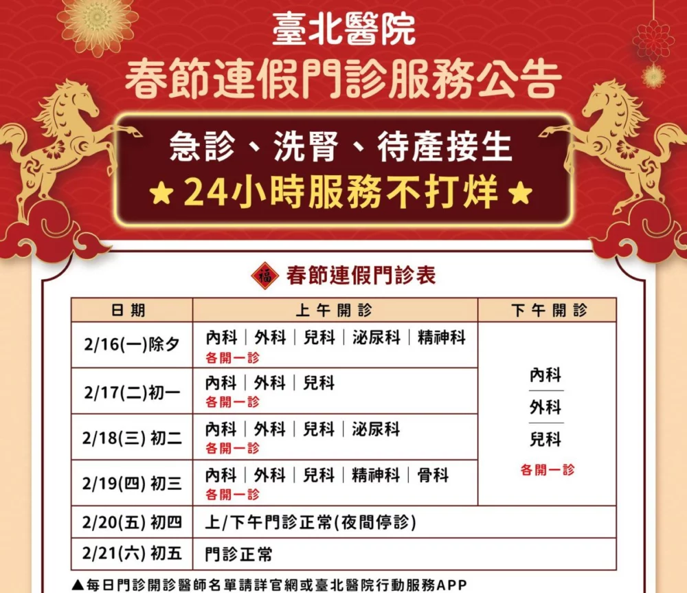 (記者陳志仁/台北報導)農曆春節連假將至,為確保民眾在假期間醫療照護不中斷衛生福利部臺北醫院公布春節醫療服務規劃,急診…
