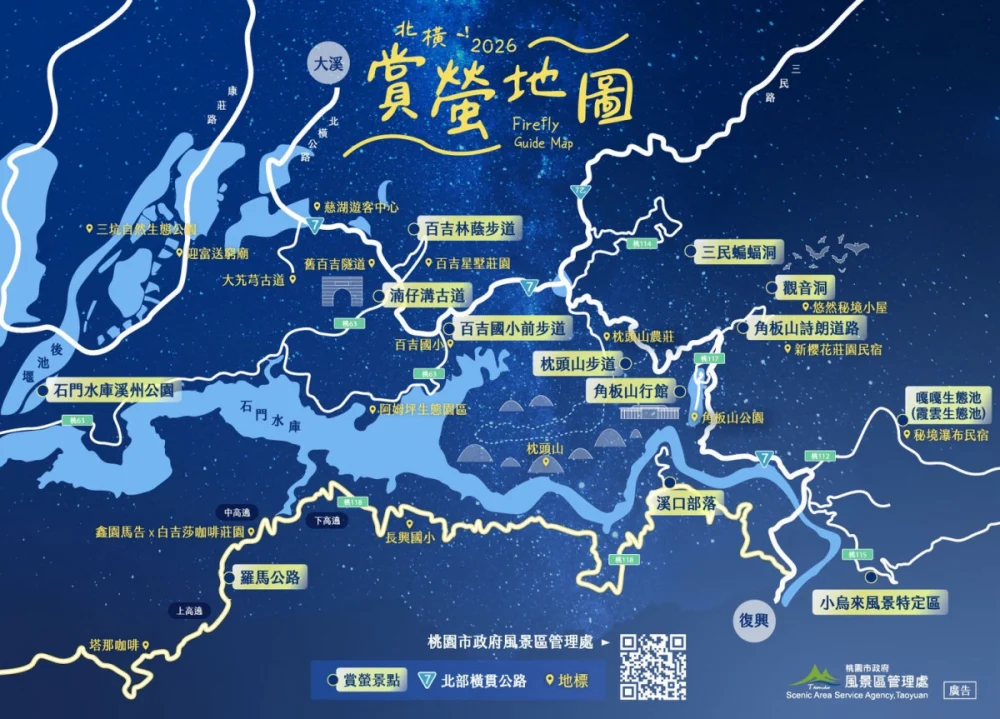 記者葉志成/桃園報導 桃園北橫賞螢季即將登場,歡迎國內外旅客按圖索驥親身體驗。 2026 北橫賞螢地圖公布:跟著螢光感受最夢幻…