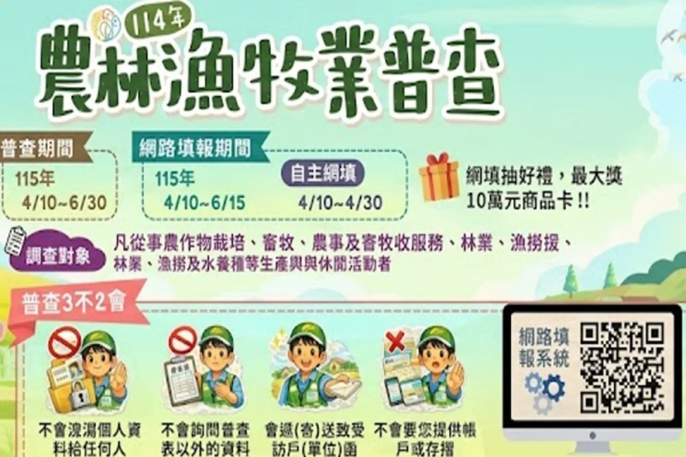 記者李文生/台南報導 行政院主計總處主辦,各地方政府配合辦理的114年農林漁牧業普查,即日起至6月30日舉辦。台南市政府表示,…