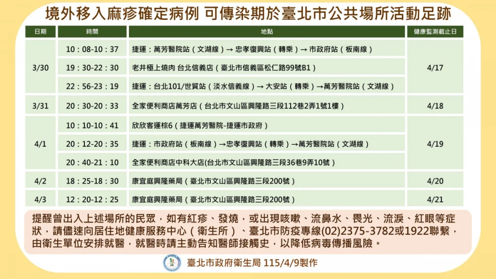 地方中心/台北報導 (圖/台北市府衛生局) 近2年全球有明顯的麻疹疫情,國內亦無法倖免,亦出現數起麻疹境外移入與本土病例,…