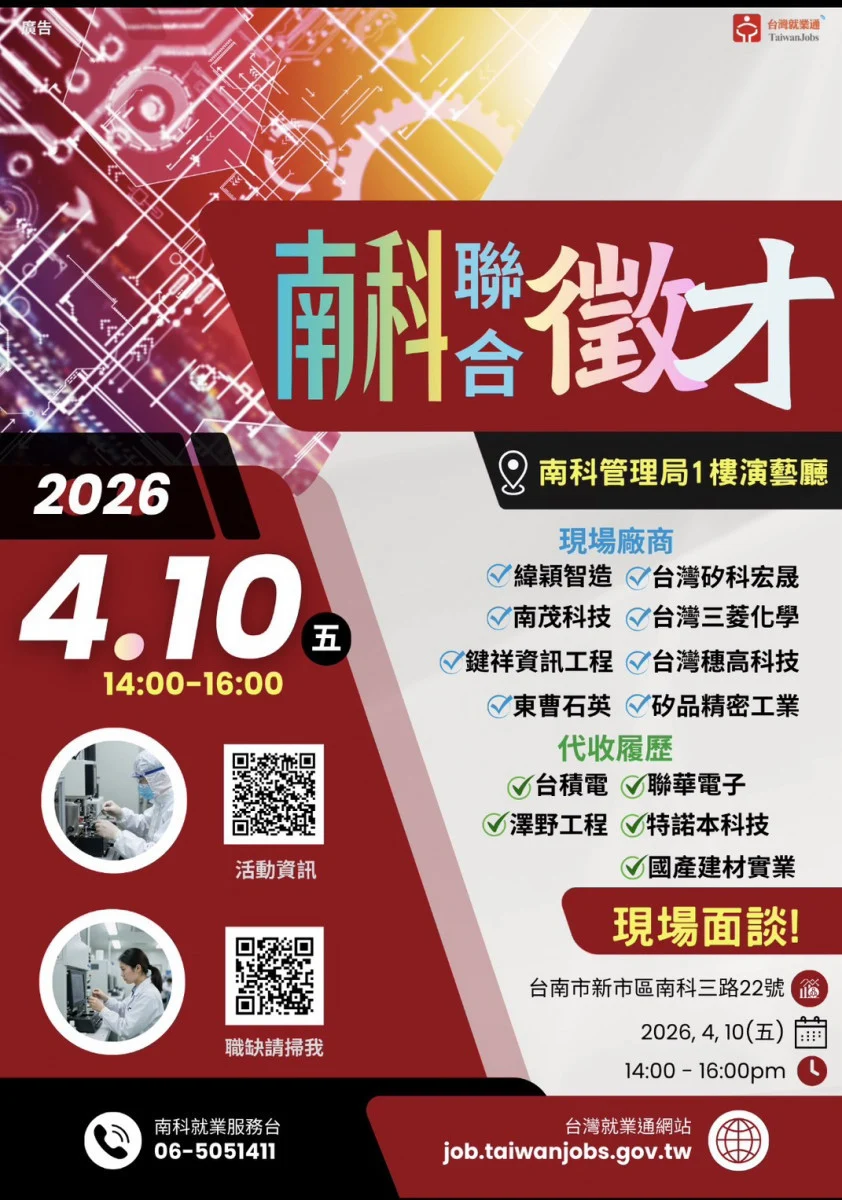 記者吳順永/台南報導 勞動部勞動力發展署雲嘉南分署永康就業中心將於4月10日(週五)下午2時至4時,在南科管理局1樓演藝廳舉辦…