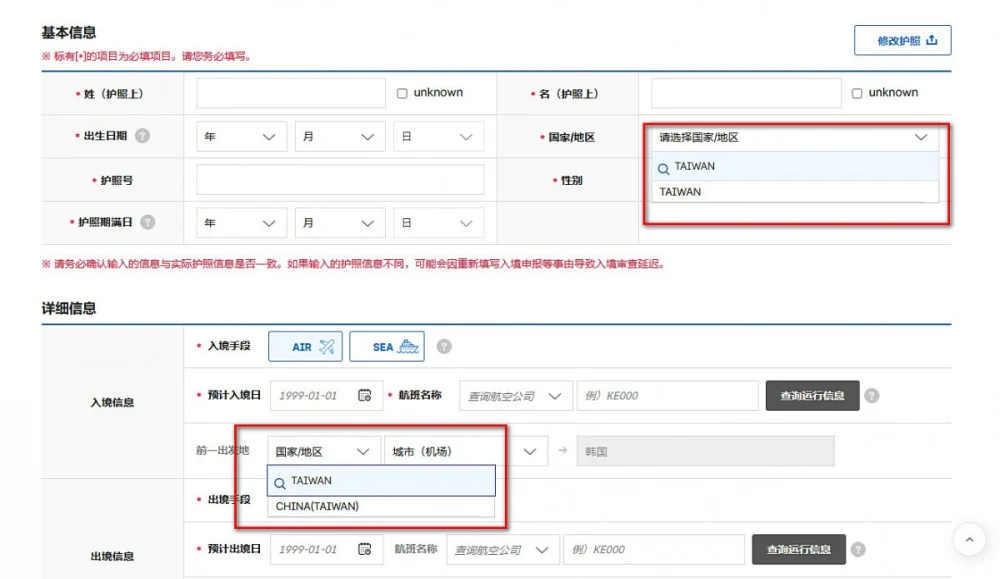 政治中心/綜合報導 (圖/翻攝自Korea Electronic Arrival Card網站) 針對韓國政府電子入境卡系統的「出發地」及「下一目的地…